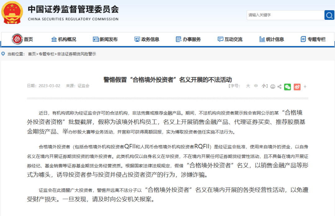 早在2023年,证监会就发文:警惕假冒“合格境外投资者”名义开展的不法活动