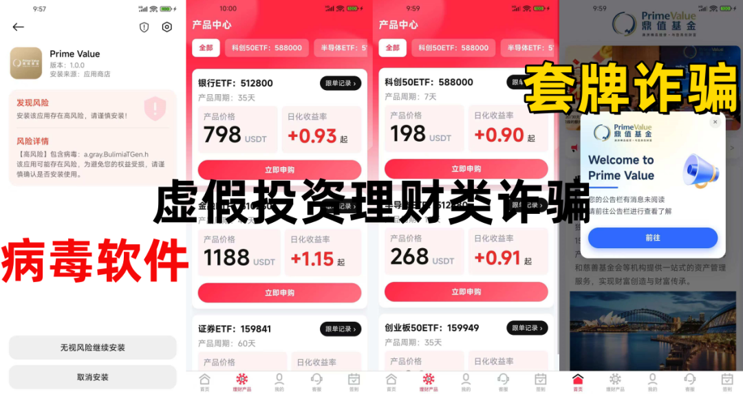 虚假理财诈骗。不法分子冒充境外某基金公司的名义,制作散布涉诈APP,打着投资理财的旗号,虚构推广“银行ETF”“金融ETF”“证券ETF”“科创50ETF”“半导体ETF”等高额返利理财项目。