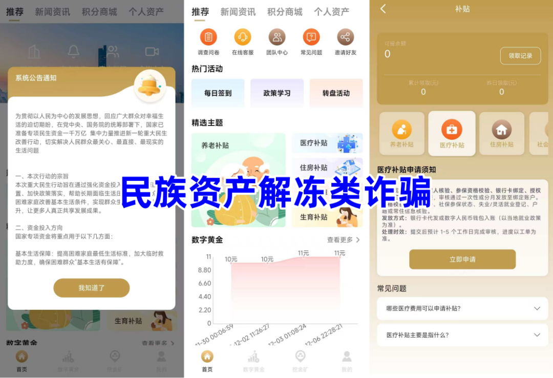 民族资产解冻诈骗。不法分子冒充某部门的名义,打着“民生保障”的旗号,制作散布涉诈APP,声称发放一千万亿民生保障,参与者实名注册即可领取3万“养老补贴”“住房补贴”“就业补贴”“生育补贴”等,同时每天签到、挖矿可以领取数字黄金。