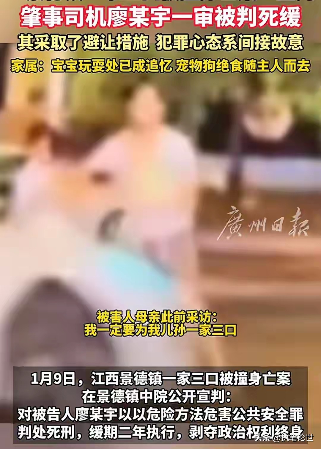 20岁的廖新宇因以危险方法危害公共安全罪,被判处死刑缓期二年执行。而被他129公里时速撞飞的一家三口,再也等不到团圆的机会。