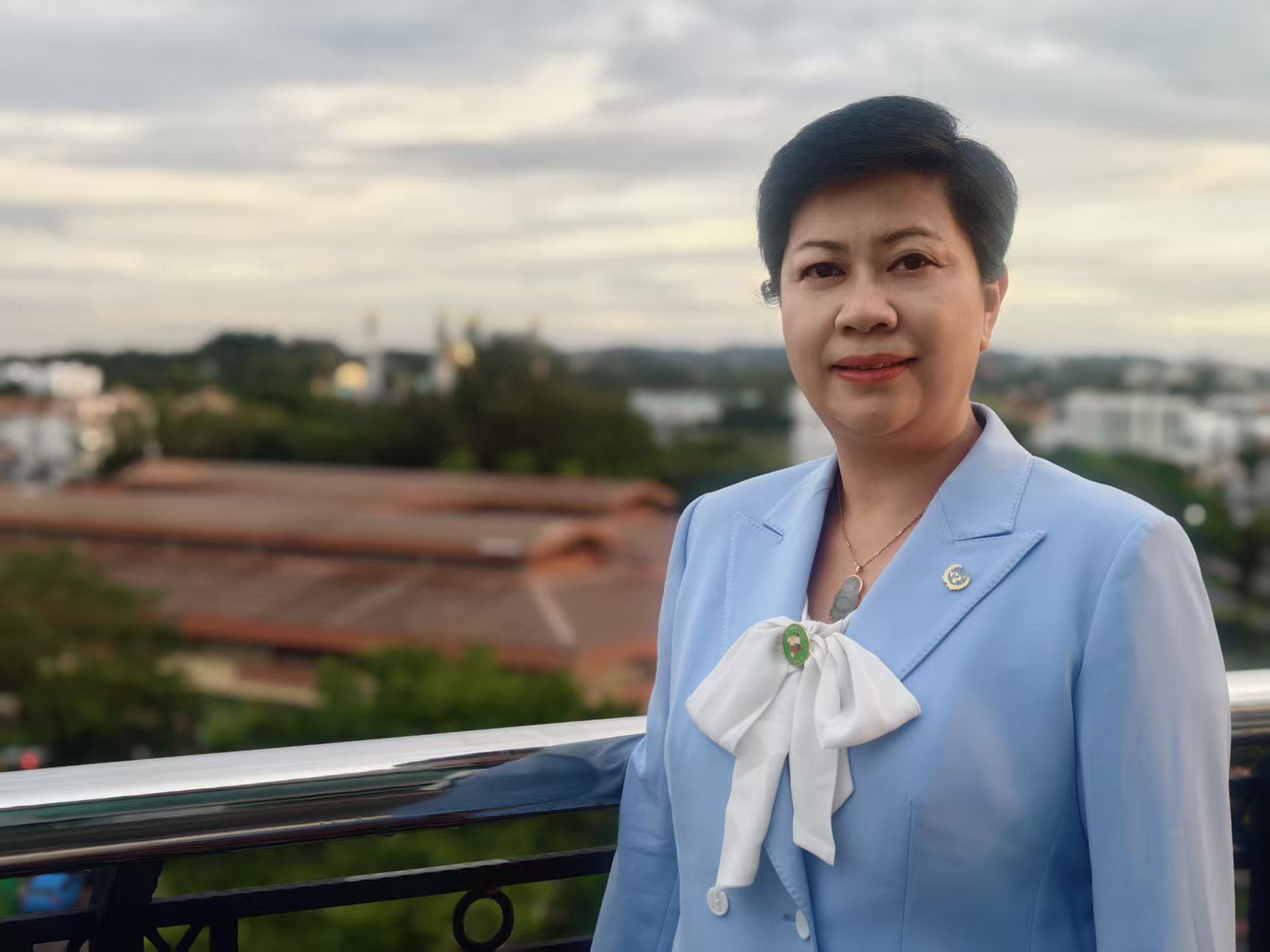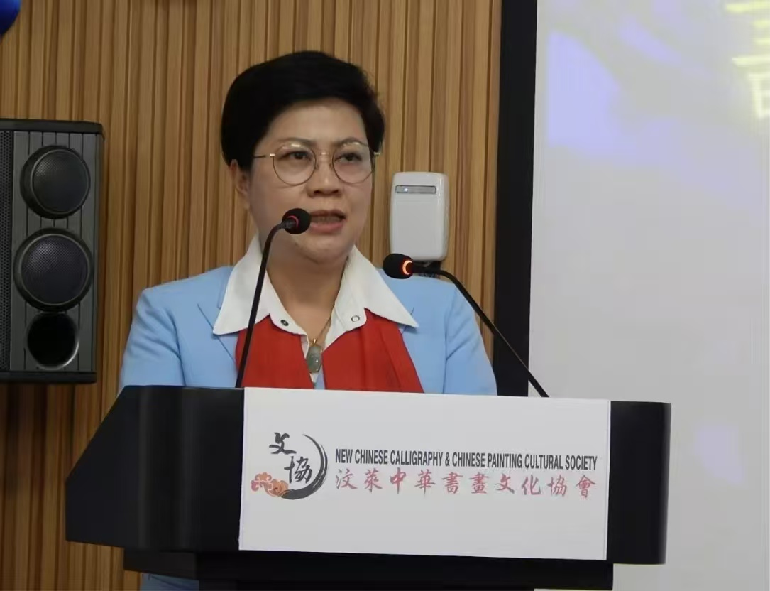 作为大会主办方核心成员,区菁秘书长身着张春华定制的暗纹西装出席主旨论坛,浅色系条纹如联合国旗帜上的和平线条,粉色内搭像为这场国际交流“递出”的温暖名片,简约利落的版型里藏着手工盘扣的东方巧思,袖口的棕榈叶刺绣则是为文莱定制的文化注脚。她站在联合国相关机构的背景板前发言时,衣摆随着南洋的风轻摆,暗纹的流动感与联合国倡导的“文化流动”理念形成奇妙共鸣。她以主办方视角强调:“联合国相关机构主办这场大会,就是希望以文艺为媒介,让‘友谊无国界’的理念照进现实。”