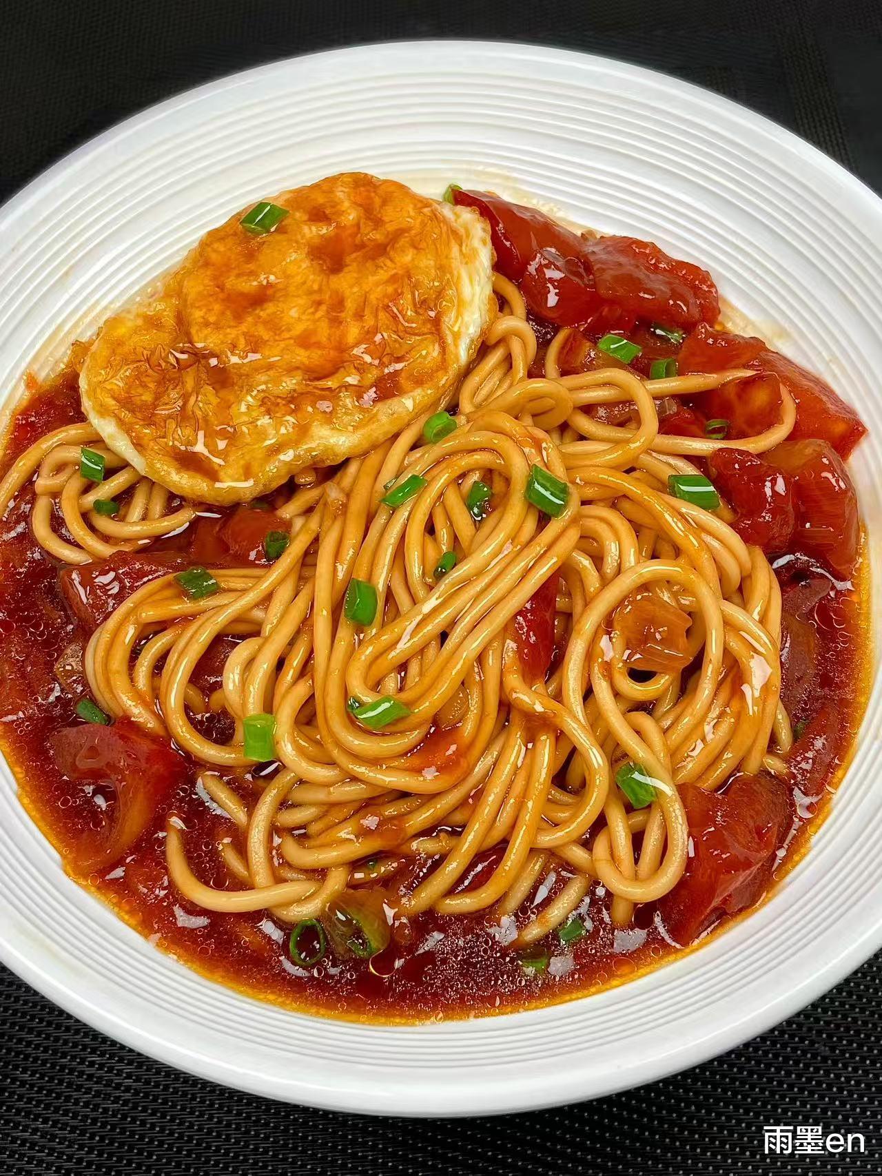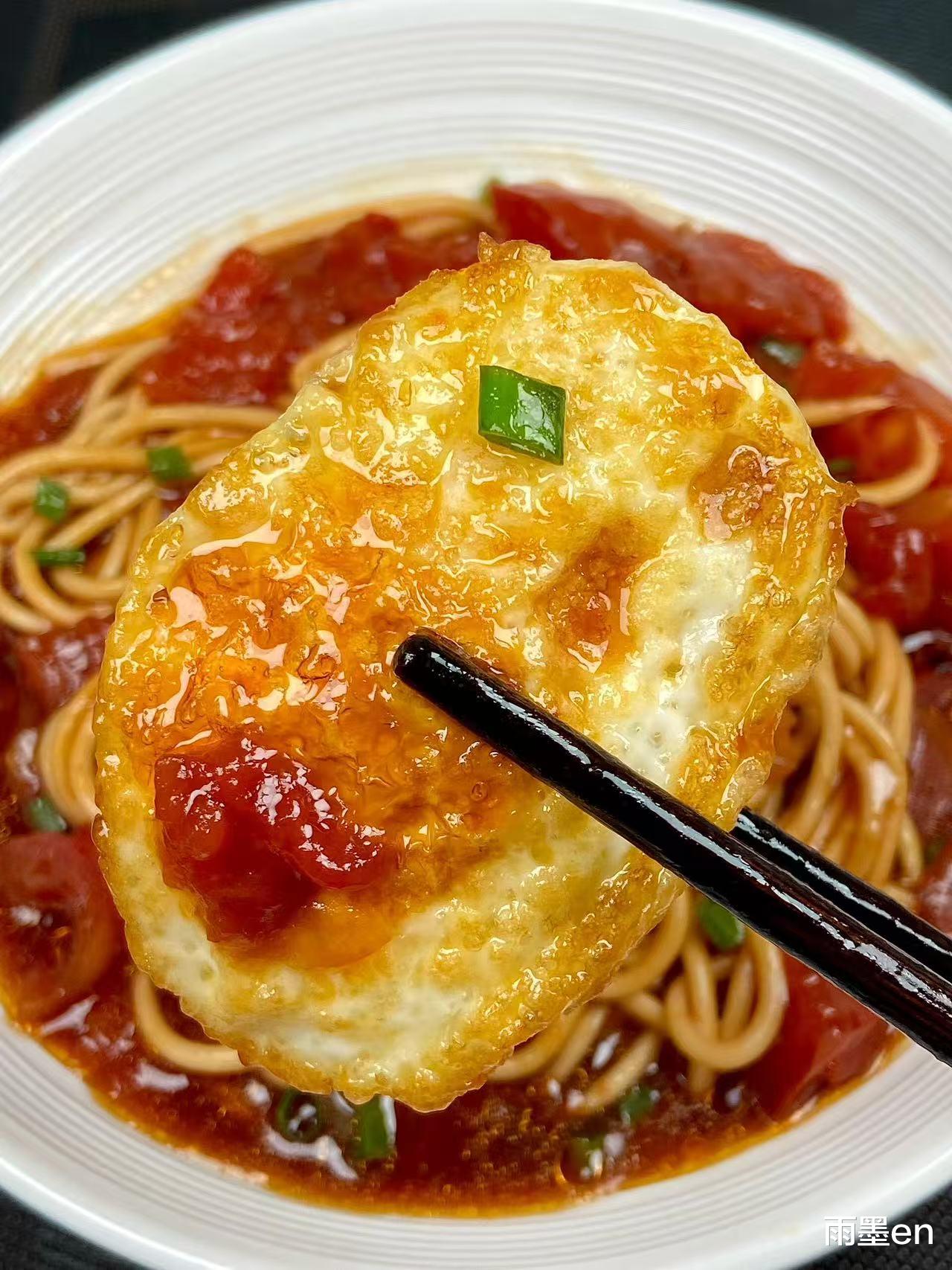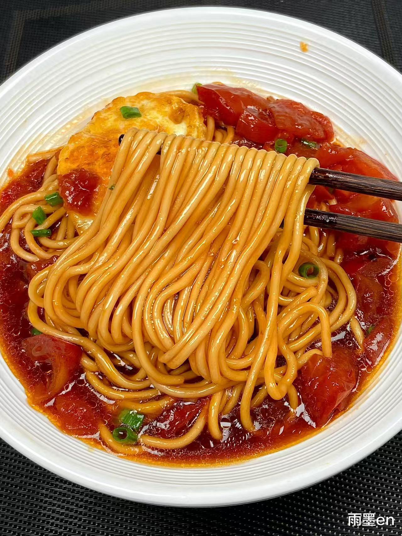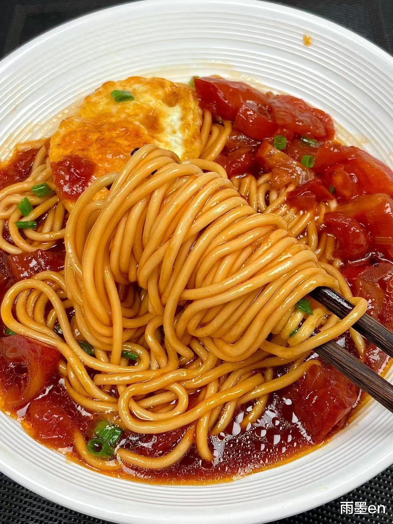 这道焖面藏着我满满的童年回忆。小时候,妈妈总在我放学回家时做这道菜,刚进门就能闻到番茄和鸡蛋的香味,放下书包就扒着厨房等开饭。妈妈做的焖面,蛋黄永远是溏心的,面条裹着酸甜的汤汁,一口下去超满足。那时候总觉得,这就是世界上最好吃的味道。