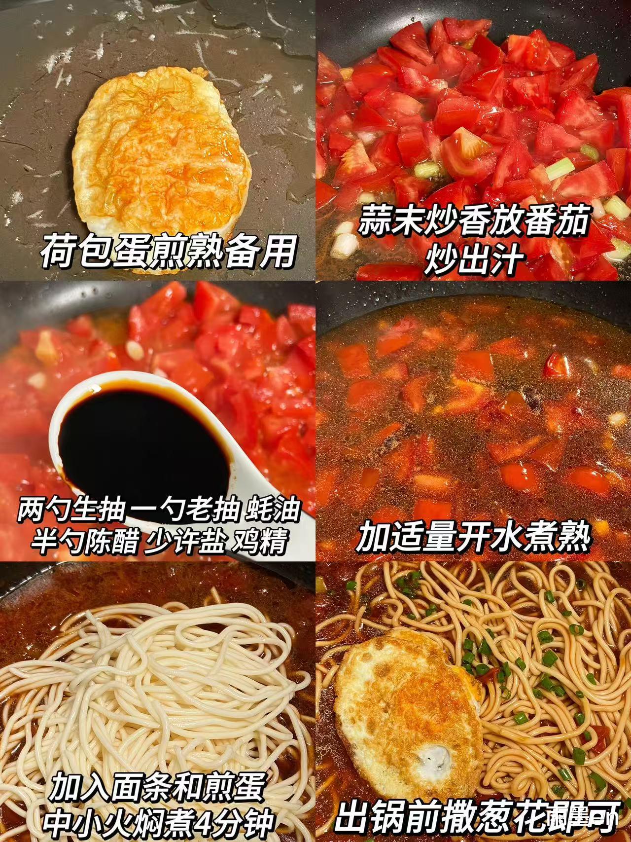 现在开始正式操作!第一步,处理番茄,去皮后切成小块,葱花蒜末备好;第二步,起锅热油,打入鸡蛋,煎至两面金黄,盛出备用;第三步,锅里留少许油,放入葱花蒜末爆香,倒入番茄块,大火翻炒,加一勺盐、半勺糖,炒到番茄出沙、汤汁浓稠;第四步,加适量清水,水开后放入面条,煮至七八成熟(比平时煮面少煮2分钟);第五步,把煎好的荷包蛋放回锅里,淋一勺生抽,转小火焖3-5分钟,让面条吸饱番茄汤汁;最后,关火淋少许香油,撒上葱花,拌匀就能出锅啦!