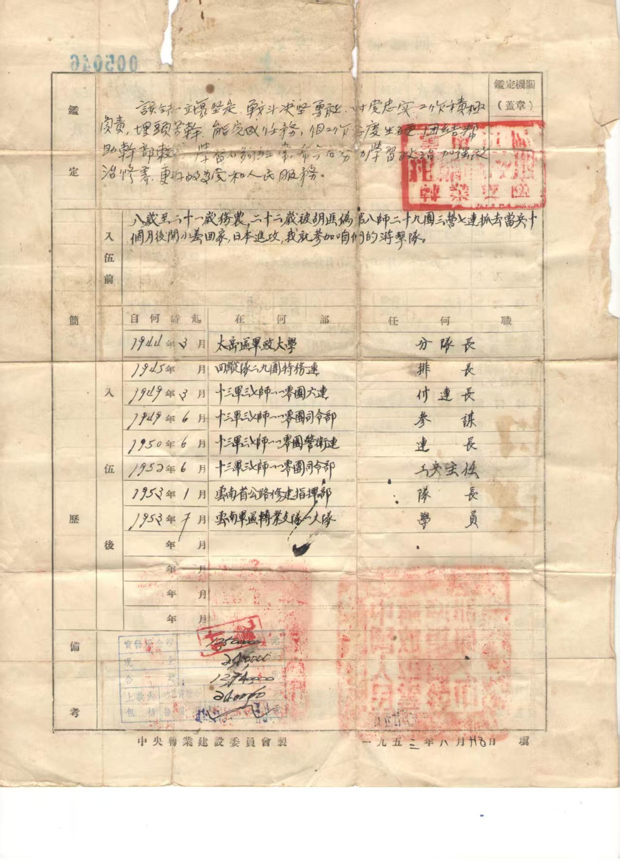 1952年6月十三军三七师一一零团司令部工兵主任;(解放战争时期)