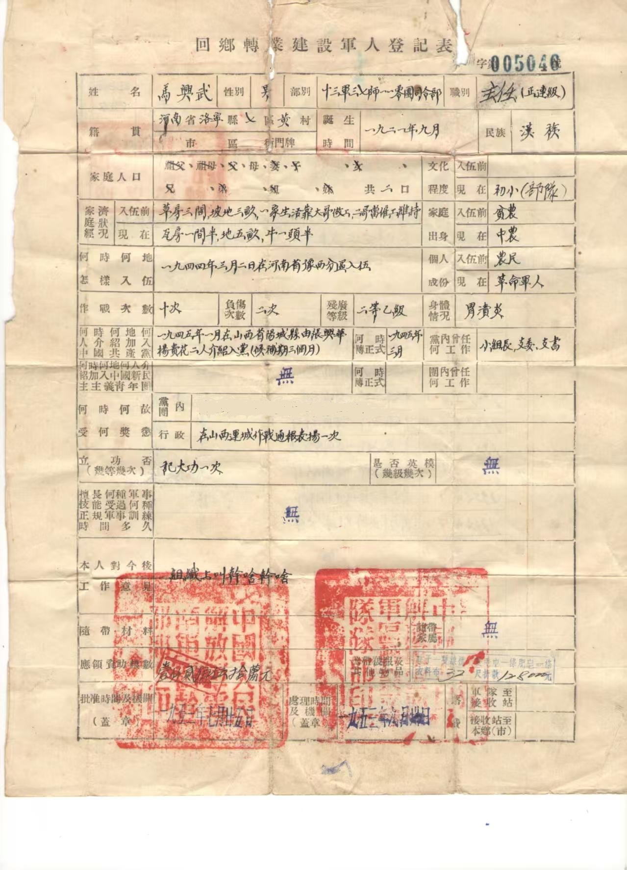 从此踏上抗日革命战争。那些年,父亲跟着 110团转战南北。从事大型作战十次、曾参加历史上闻名的淮海战役、渡江战役、西南解放、华北解放和华中南、二次负伤、系二等已级革命伤残军人(淮海战役负伤)、进军西南荣立师级大功一次、山西运城时受部队通报表扬一次;他没有辜负革命烈士张兴华的希望、后来在进军大西南时受司令部授予大功、立下赫赫战功的部队,彼时正活跃在抗日前线。同年从太岳区军政大学回到部队二九团特务连任排长;服从党组织安排。作为警卫连连长,他护卫过指挥部的灯火;身为工兵主任,他在枪林弹雨中开辟道路。战友们记得他善用地形设伏,却没人知道他的手臂早已被弹片削去一块肉,那道疤痕,藏在粗布衣衫下整整半生。