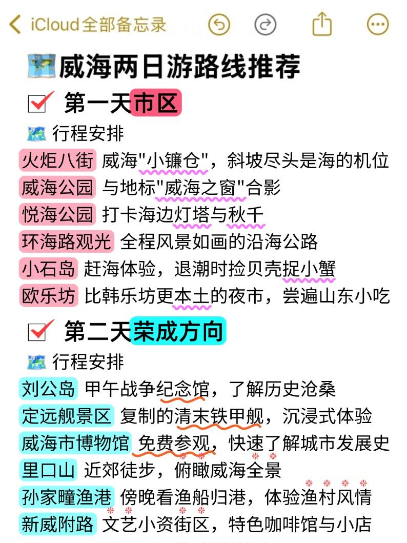🗺️两天一夜旅游路线Day1 :火炬八街→威海公园→悦海公园→环海路→小石岛赶海→欧乐坊夜市Day2:刘公岛→定远舰→