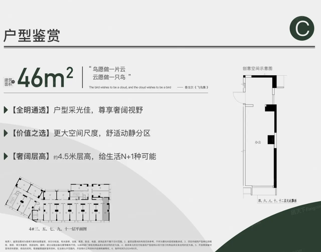 C户型(建面约46平方米): 该户型为一室一卫设计,空间相对宽敞。客厅与卧室之间采用隔断设计,增加了私密性。厨房采用独立空间设计,避免了油烟对室内空气的影响。卫生间面积较大,使用起来更为舒适。该户型适合对居住空间有一定要求的单身人士。