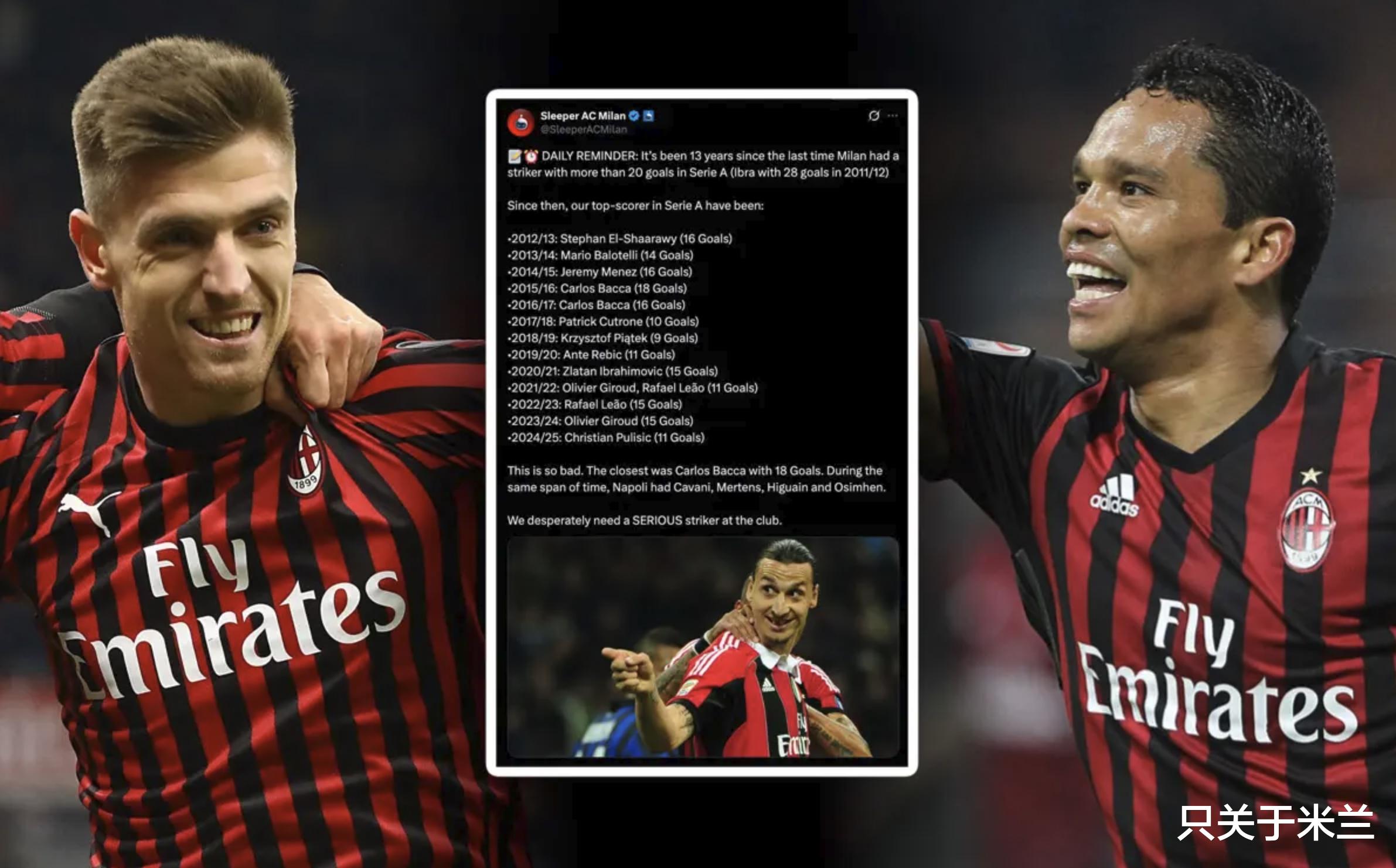 正如SleeperMilan在X平台上指出的,米兰已经十三年没有出现过单赛季意甲进球超过20个的前锋了。上一次达成此成就的还是兹拉坦·伊布拉希莫维奇,他在2011-12赛季攻入了28球。