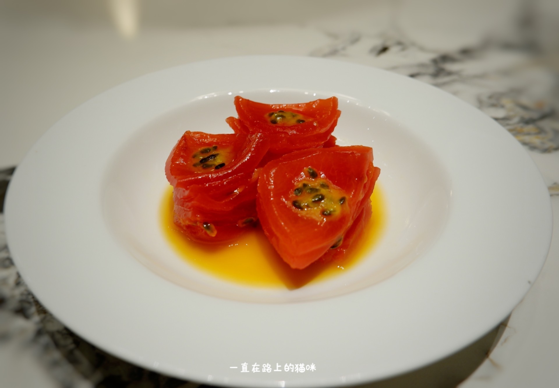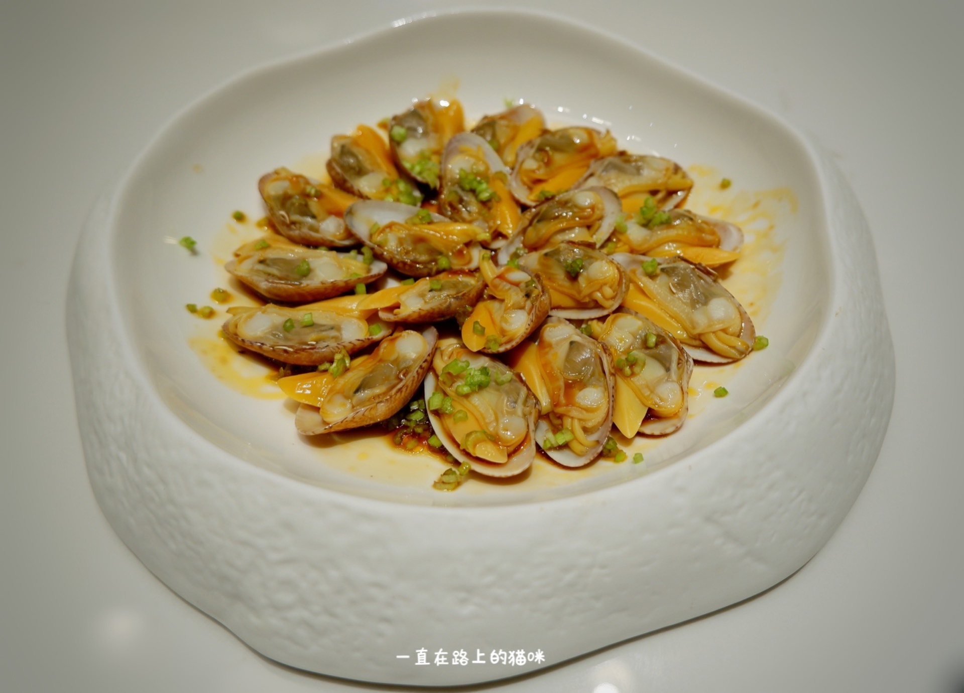 【推荐美食】:前菜是开胃的百香果渍,看起来红彤彤的就很诱人,吃起来酸甜爽口开胃。捞汁油蛤整齐的摆盘,全部去好一半壳,吃起来很方便,肉鲜美细嫩,一口一个吃的停不下来。