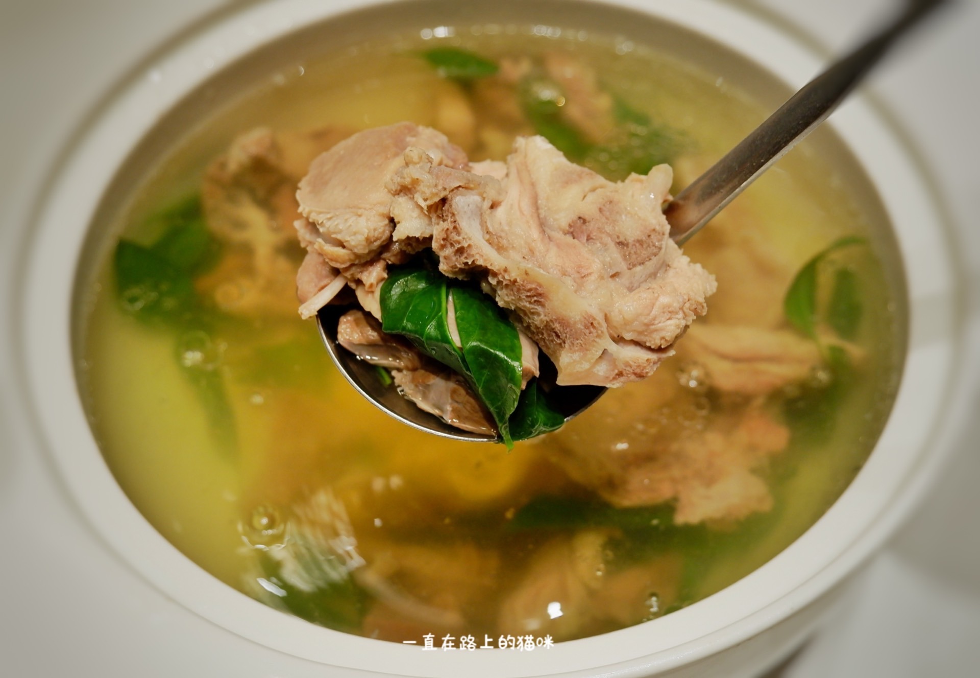 枸杞叶炖全猪汤:里面有猪骨、猪肉、猪心等等,给料足汤色看起来清亮但是肉味香浓,枸杞叶特有的清香,一边吃肉一边喝汤好满足。