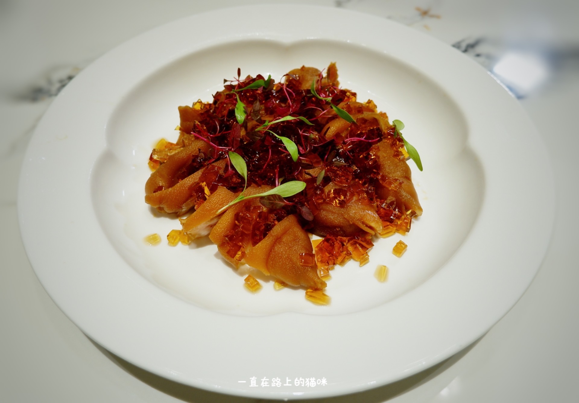 冷泡去骨猪手:猪手用的冷菜做法,去了骨切成小块,吃起来皮脆肉嫩,上面撒了一层小方块状的猪皮冻使其口感更丰富。