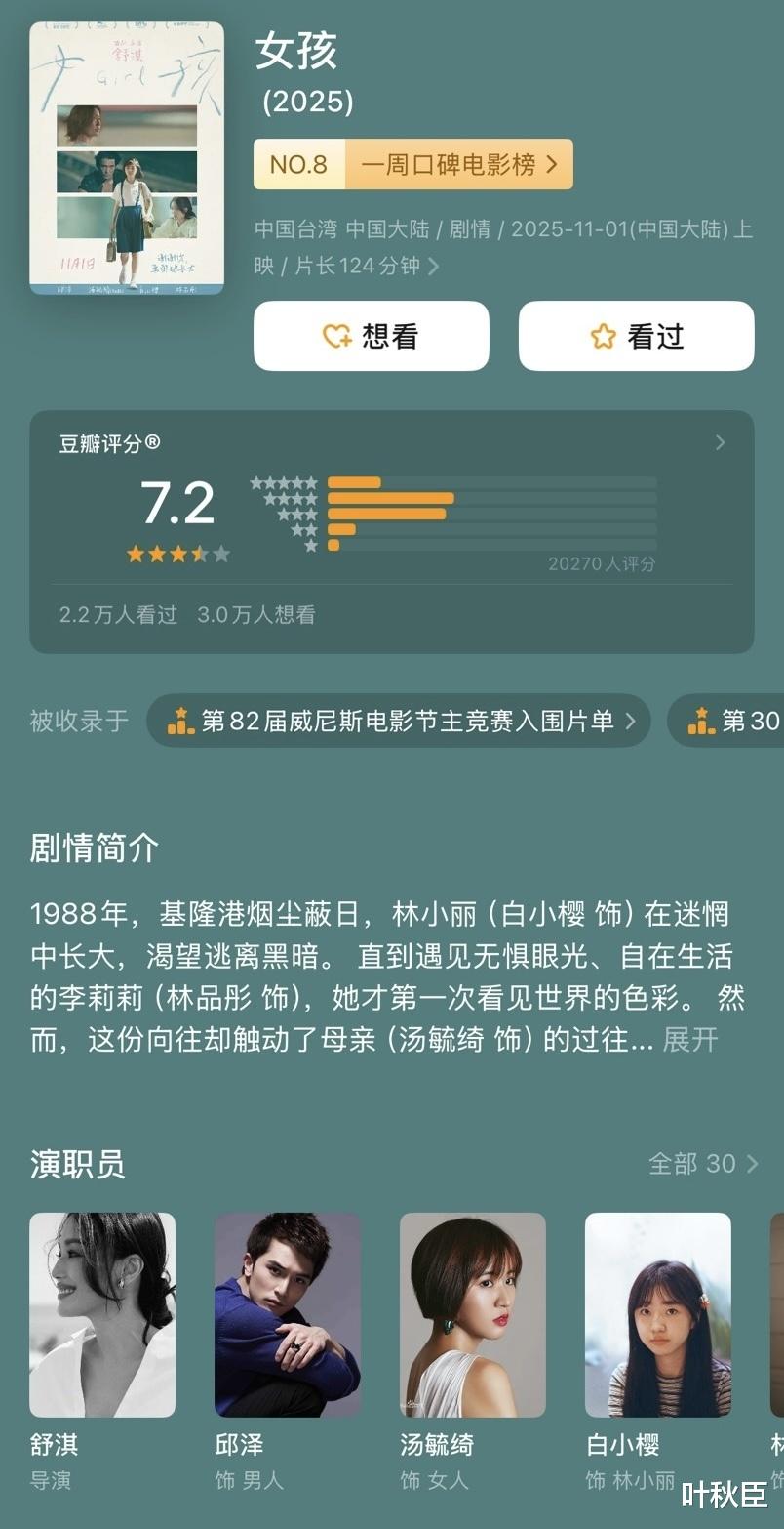 白小樱于2007年出生,年龄与影片的人物适配度非常高。虽然过去拍了一些影视剧,但没有热度特别高的,《女孩》是她最有水花的一部。