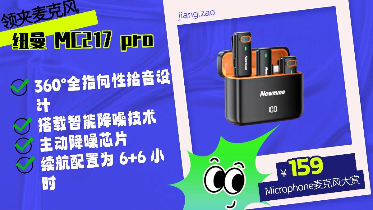 纽曼 MC217 pro这款更倾向于预算有限、且只是想试水领夹麦的纯新手。它采用 360°全指向性拾音设计,能自然捕捉声音细节,日常录语音备忘、简单短视频旁白完全够用;还搭载智能降噪技术,配合主动降噪芯片,人声还原中规中矩,没有明显失真。在50 米内无遮挡环境下传输稳定,短距离移动拍摄几乎不会断连;而且机身仅 15g 重,夹戴轻便;操作极简,开机即能用,不用研究复杂参数,新手秒上手。续航配置为 6+6 小时,满足日常短时间创作需求,不用频繁充电。