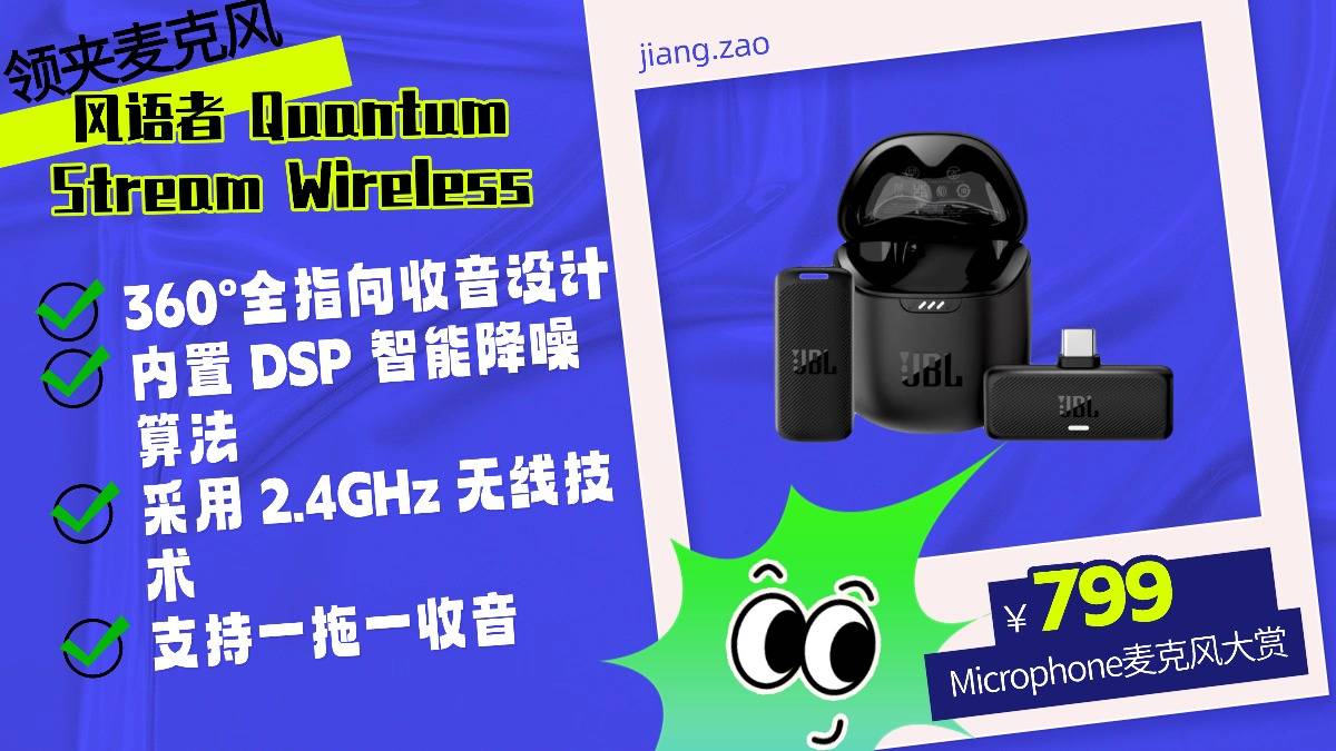 JBL 风语者 Quantum Stream Wireless拥有扎实的基础性能。它搭载 360°全指向收音设计,配合高灵敏度拾音单元,能无死角捕捉声音细节,日常录口播、简单短视频完全够用;内置 DSP 智能降噪算法,能有效过滤室内轻微环境杂音,让人声更突出,避免多余干扰。同时传输上采用 2.4GHz 无线技术,100 米无遮挡环境下连接稳定,几乎没有延迟和断连现象.