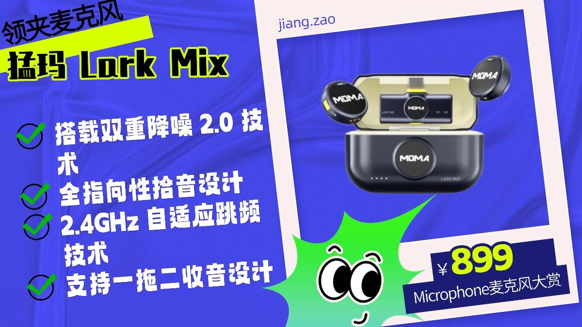 猛玛 Lark Mix更适合追求双重降噪和长续航的创作者。它搭载双重降噪 2.0 技术,室内外拍摄都能有效压制干扰;全指向性拾音设计覆盖范围广,能捕捉清晰声音细节。它采用了2.4GHz 自适应跳频技术,300 米无遮挡环境下传输稳定,长距离移动拍摄不用担心断连;支持一拖二收音,双人访谈、团队协作场景能轻松应对,不用额外搭配设备。续航配置扎实,10+20 小时总续航,全天拍摄不用频繁充电;机身仅 9g 重,夹戴轻便,收纳时不占空间,出门携带很省心。
