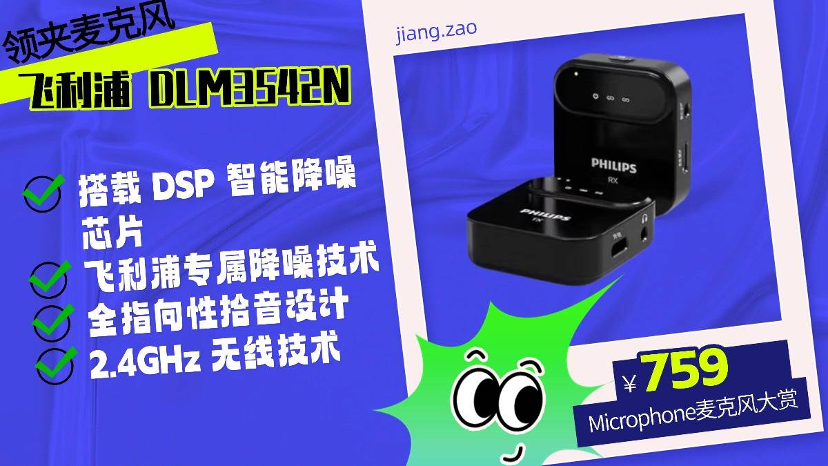 飞利浦 DLM3542N相对来说更侧重室内场景创作。首先它搭载 DSP 智能降噪芯片,配合飞利浦专属降噪技术,能深度过滤室内低频杂音;而且拥有全指向性拾音设计能灵敏感知人声。还采用 2.4GHz 无线技术,50 米内无遮挡环境下传输稳定;支持一拖二收音,续航配置为 6+12 小时,满足全天短时间拍摄需求;操作简单易上手,即插即用,适配手机、相机等常用设备,新手不用复杂调试。