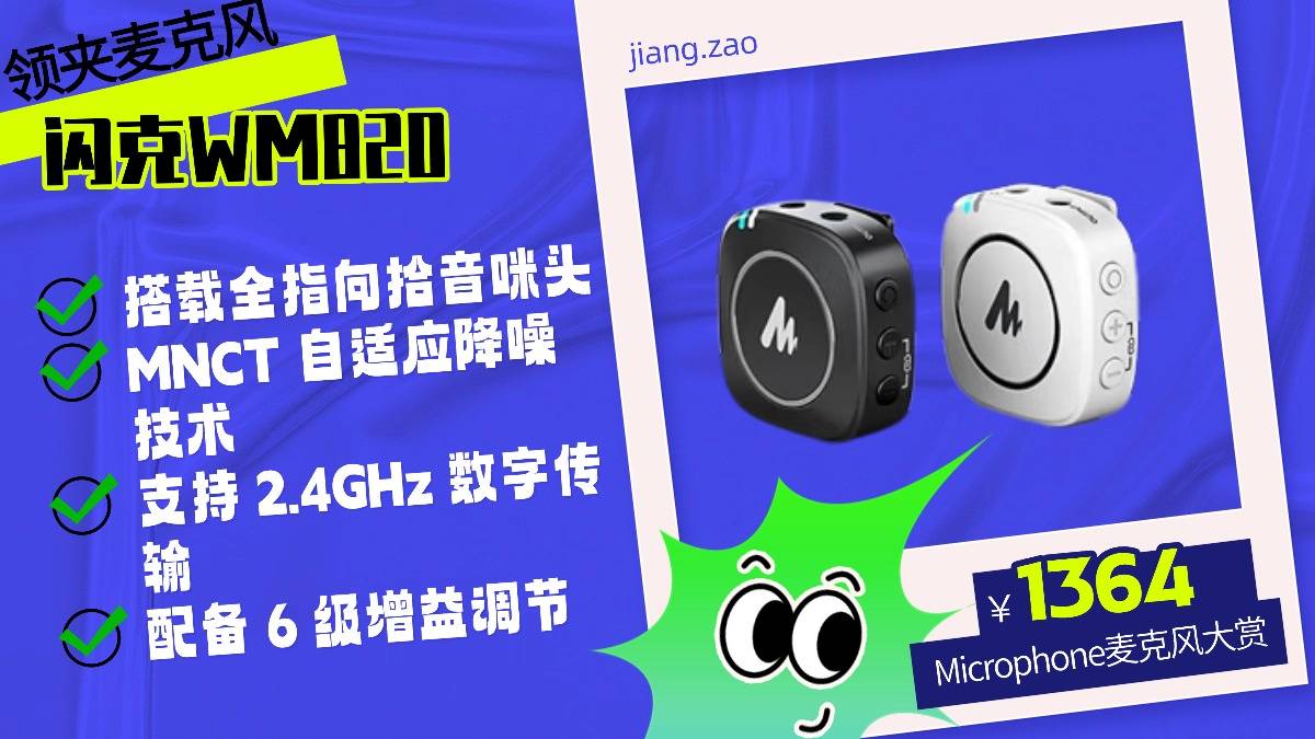 闪克 WM820 相对来说更侧重便携颜值与实用功能的入门级无线领夹麦。它搭载全指向拾音咪头与 MNCT 自适应降噪技术,信噪比达 82dB,能精准捕捉声音细节并抑制环境杂音;还支持 2.4GHz 数字传输,50 米无遮挡环境下连接稳定、延迟低,音画同步流畅。而且机身小巧轻便,仅 28g 重,夹戴无负担,开机 2 秒自动配对,还配备 6 级增益调节与耳返监听功能,操作便捷。而且续航可达 6 小时,支持边充边用,兼容手机、相机等多设备,配件齐全开箱即用,可选一拖二版本适配多人场景。