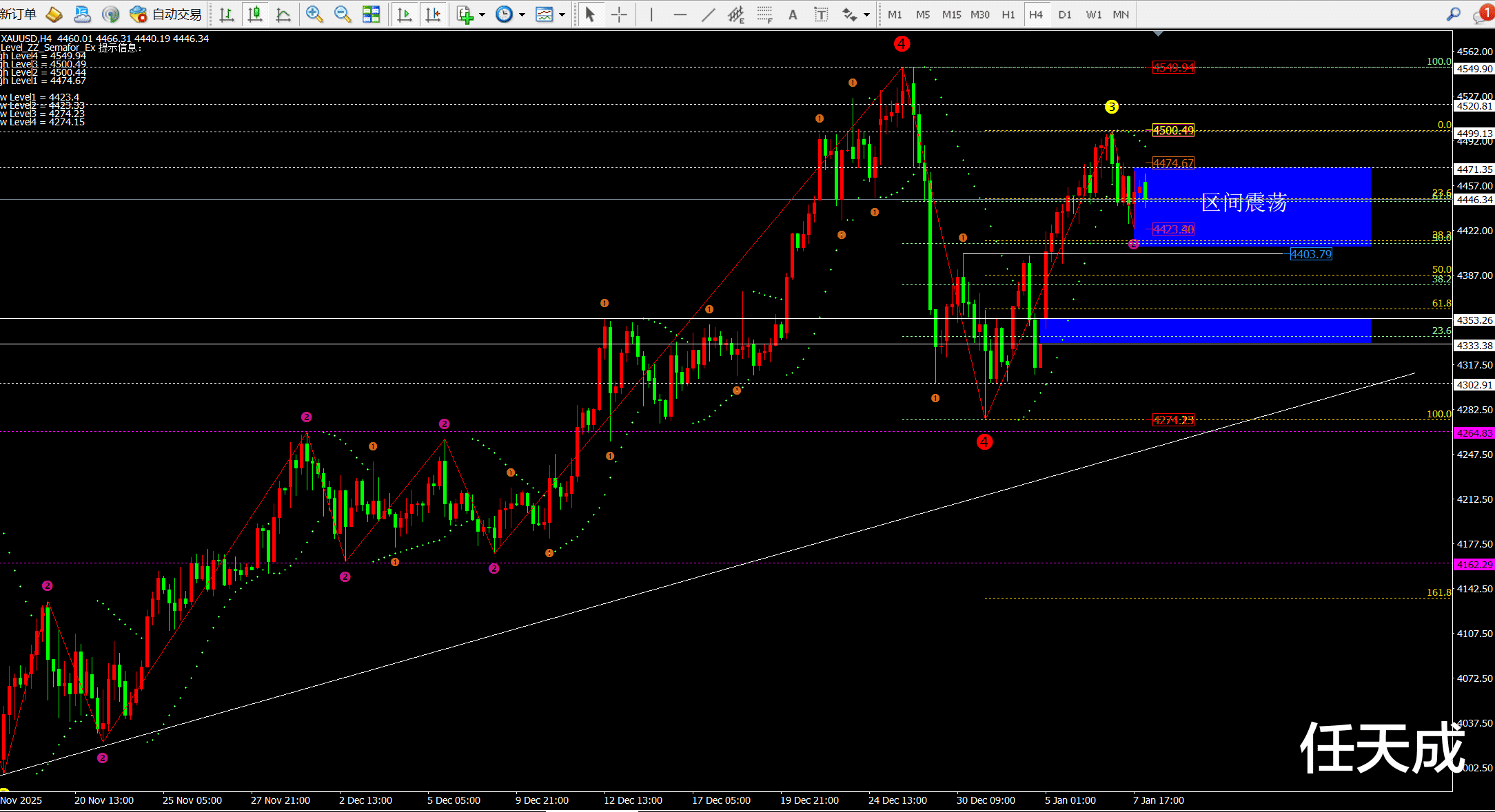综合而言:日内关注昨日低点支撑,跌破价格会持续下跌试探4380一线;而4小时目前属于区间震荡,关注4429和4412一线的支撑,不过随着4小时11点收线均线MA60将上移4420一线,所以日内就关注昨日低点4423-27的支撑。