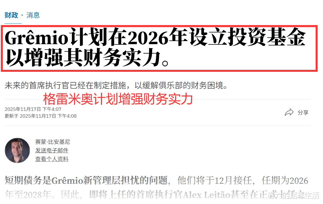现在新管理层俱计划在2026年设立投资基金来增强俱乐部的财务实力,改善俱乐部的短期债务问题。