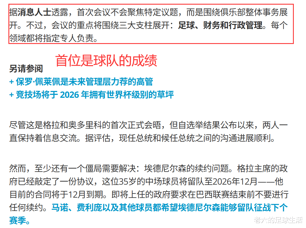 现在这段时间管理层是围绕俱乐部的三个维度——足球、财务、行政管理来开展会议挑选专人负责各个领域,摆在首位的就是足球成绩了。
