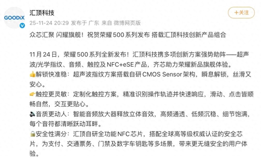 与此同时,汇顶科技也发文对荣耀 500 系列搭载的技术方案进行了确认: