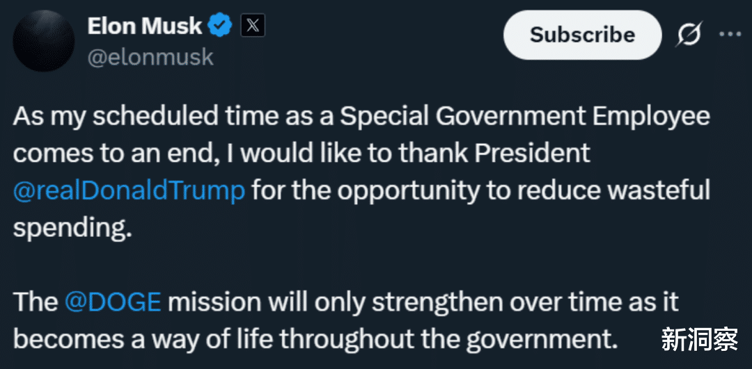 各位,我是太守。5月28日,美国企业家、政府效率部负责人埃隆·马斯克在社交媒体X上说,他作为“特别政府雇员”的任期结束。