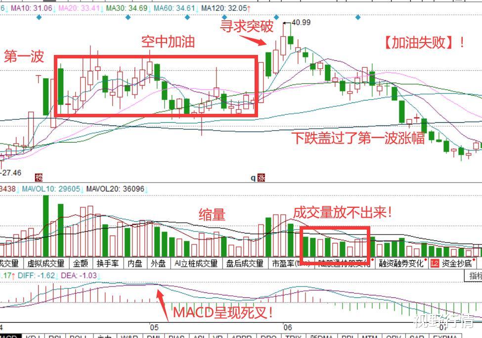 上图案例失败的主要原因就是:成交量,也就是资金量跟不上,后市资金做多意愿不足。如果发现上涨后成交量不能放大,下跌盖掉前面涨幅时,要及时止损。三个要点:1、成交量没放出来;2、下跌在盖过前期涨幅;3、MACD呈现死叉。