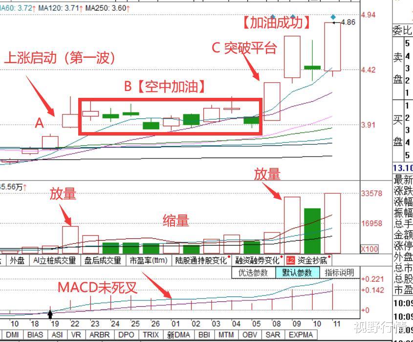 4.突破:“空中加油”成功后,股价会重新回到上涨升势,需要在前面平台寻求突破放量。