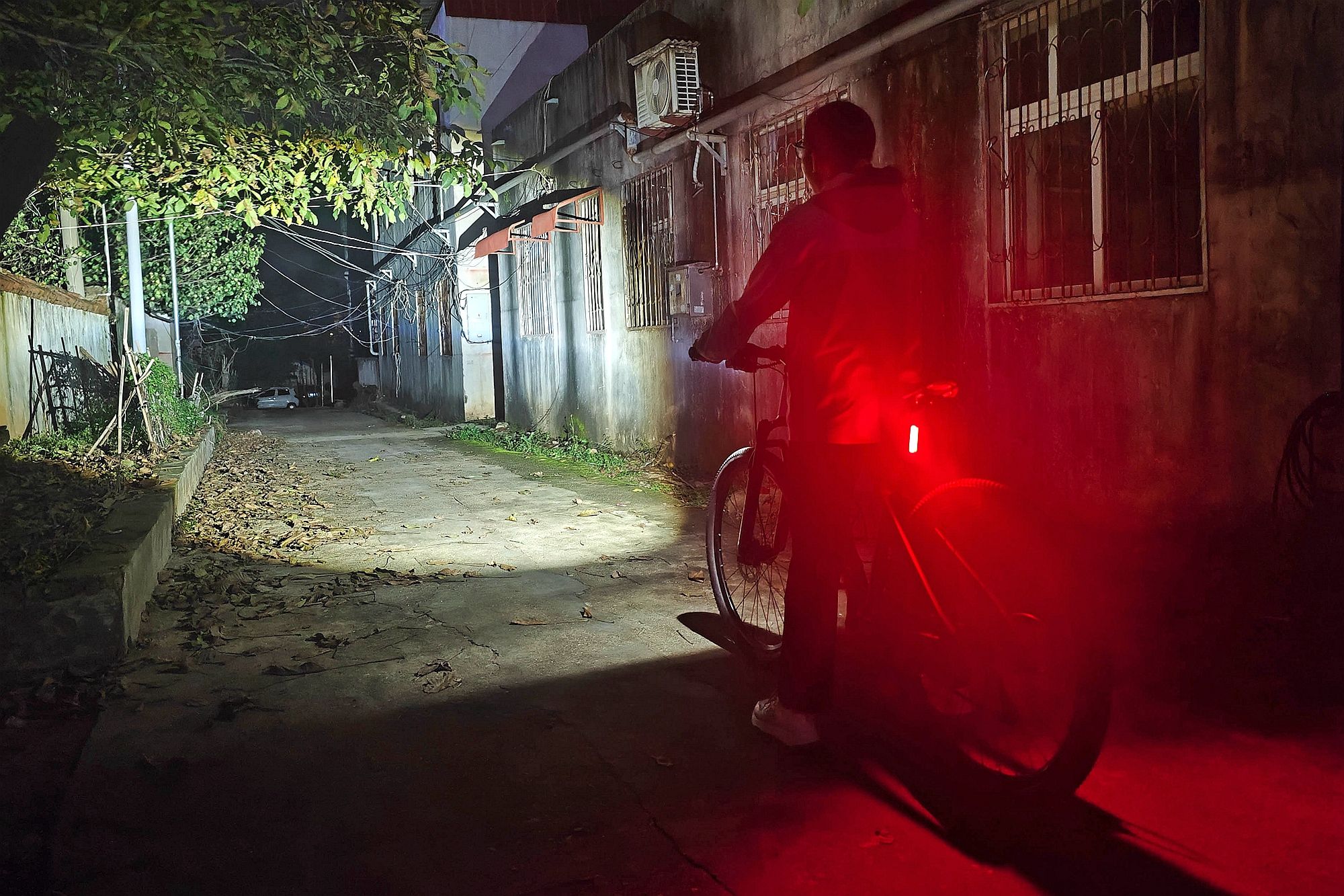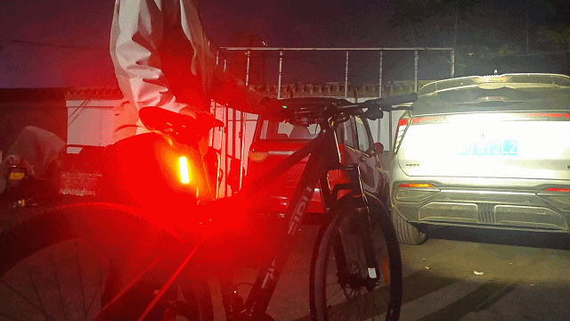 身后的SEEMEE50 PRO智能磁吸尾灯更是吸睛担当,就像照片里展现的那样,浓烈的红光在昏暗巷道里格外醒目,不仅把车身周围映得一片红,连远处巷口的居民都能一眼注意到我的存在,安全感直接拉满!