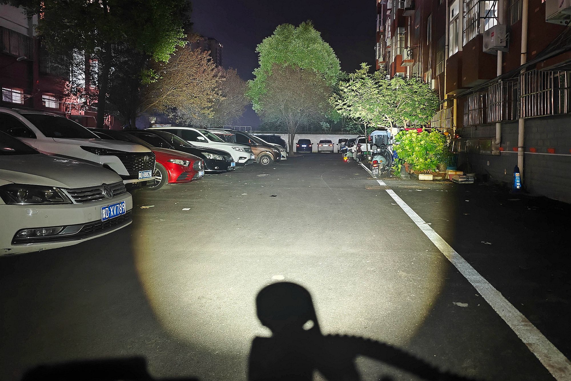 看看回到小区后的照明效果,简直比汽车灯还要亮。黑夜里车辆排列得密密麻麻,迈极炫CBL 1600 PRO前灯的光斑依旧均匀铺洒开来,把前方路面、车辆轮廓照得清清楚楚,就连远处车位线的细节都清晰可辨。