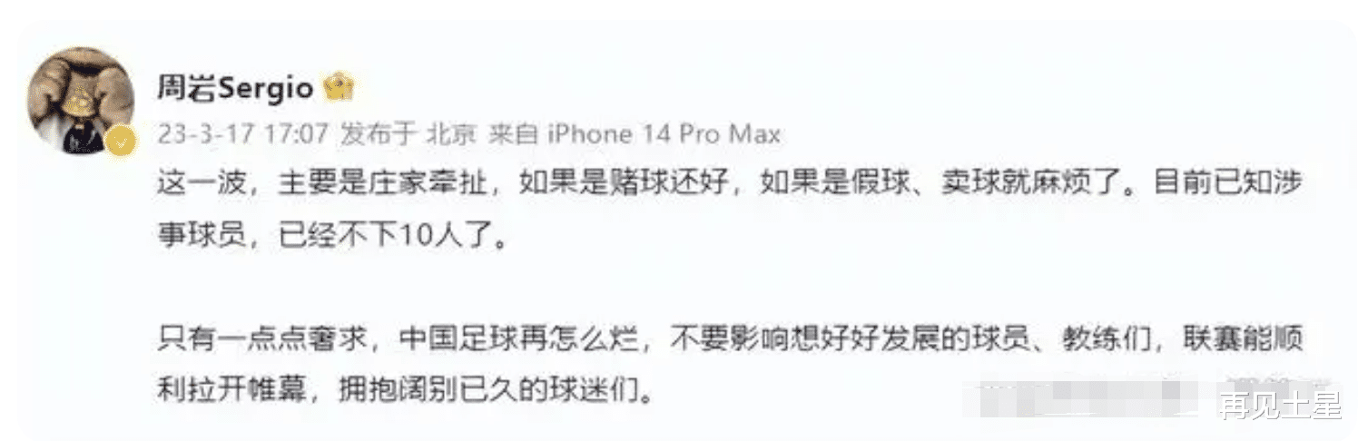 2023年注定是值得铭记的一年,足协一把手陈戌源落马,涉嫌严重违法违纪,既然查到这个级别了,很多球迷都在猜测下条大鱼究竟是谁,可时间过去一个月,足协再也没了动静,反倒是中超迎来史上最大的信任危机,在吴兴涵事件中,女主角晒出聊天记录,吴兴涵说中超现在全是假球,一场球就是三四十万,好家伙,一石激起千层浪,这引起了广大球迷的热议。以前说中超全是假球,球迷可能还不信,但现在正是反赌扫黑时刻,连陈戌源都被抓了,球迷不得不持怀疑态度,而就在今天,中超赌球事件终于出结果了,就像媒体人李平康所说,这绝对是中国足坛的大地震,他的社交软件里各种寻人启事,不停的有人问知不知道谁谁谁在哪儿。媒体人“五月小青蛙”证实,申花的孙世林和朱建荣被带走,山东的娇喆和金敬道被带走。
