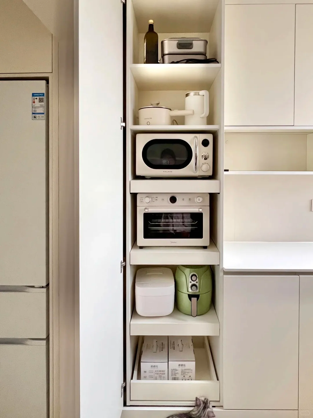 网友@香香蝶 的分享:我家放家电的位置就设计了层板抽拉设计,后面有插座,平时用的时候直接一抽就能用,不过都是小家电不是很重,也不用担心层板承受不住。
