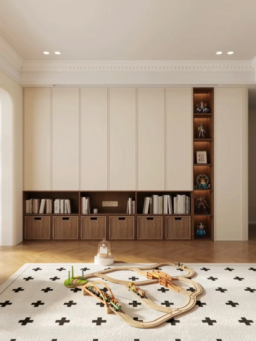 04.玩具收纳如果家里有孩子的朋友,在装修的时候一定要考虑到玩具的收纳空间,所以这个区域是针对有孩子的家庭。我们可以在孩子的房间,或者家里选择一个空间设计一个小矮柜,做抽拉的设计,平时孩子玩完的玩具,让孩子自己收到柜子里,也能锻炼孩子的独立能力。