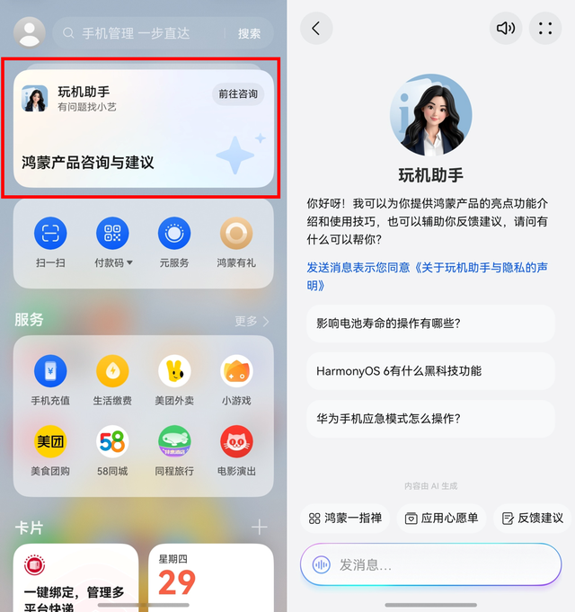 只需在桌面轻轻向右一滑,进入负一屏,找到顶部【鸿蒙产品咨询与建议】卡片,点击打开“玩机助手”对话界面,你有什么不懂的,直接问它就行。