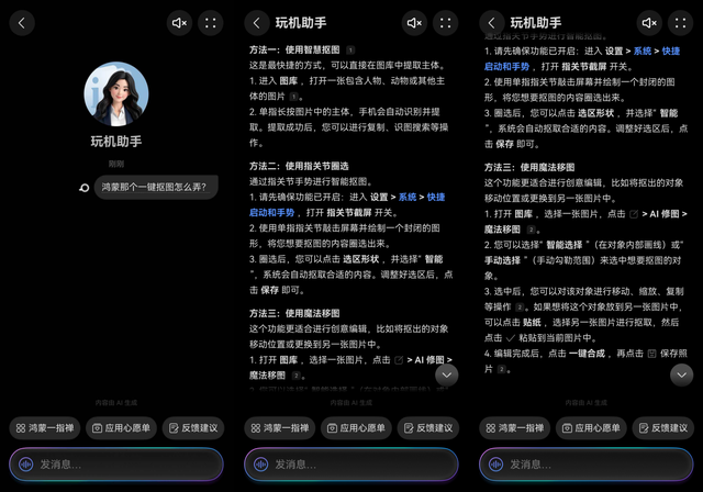 再比如,想把图片里的小猫抠出来做表情包,却不知道怎么操作?直接问“鸿蒙一键抠图怎么弄”,玩机助手立刻就能把清晰的步骤推给你。更方便的是,答案里的蓝色关键词可以直接点击,一键跳转到对应的设置页面,真正实现一步到位。
