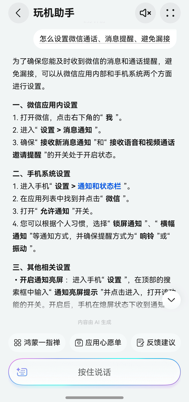 比如担心错过微信消息,不知道怎么设置微信通话和消息提醒——只需要向玩机助手提问,马上就能得到清晰详细的解答。