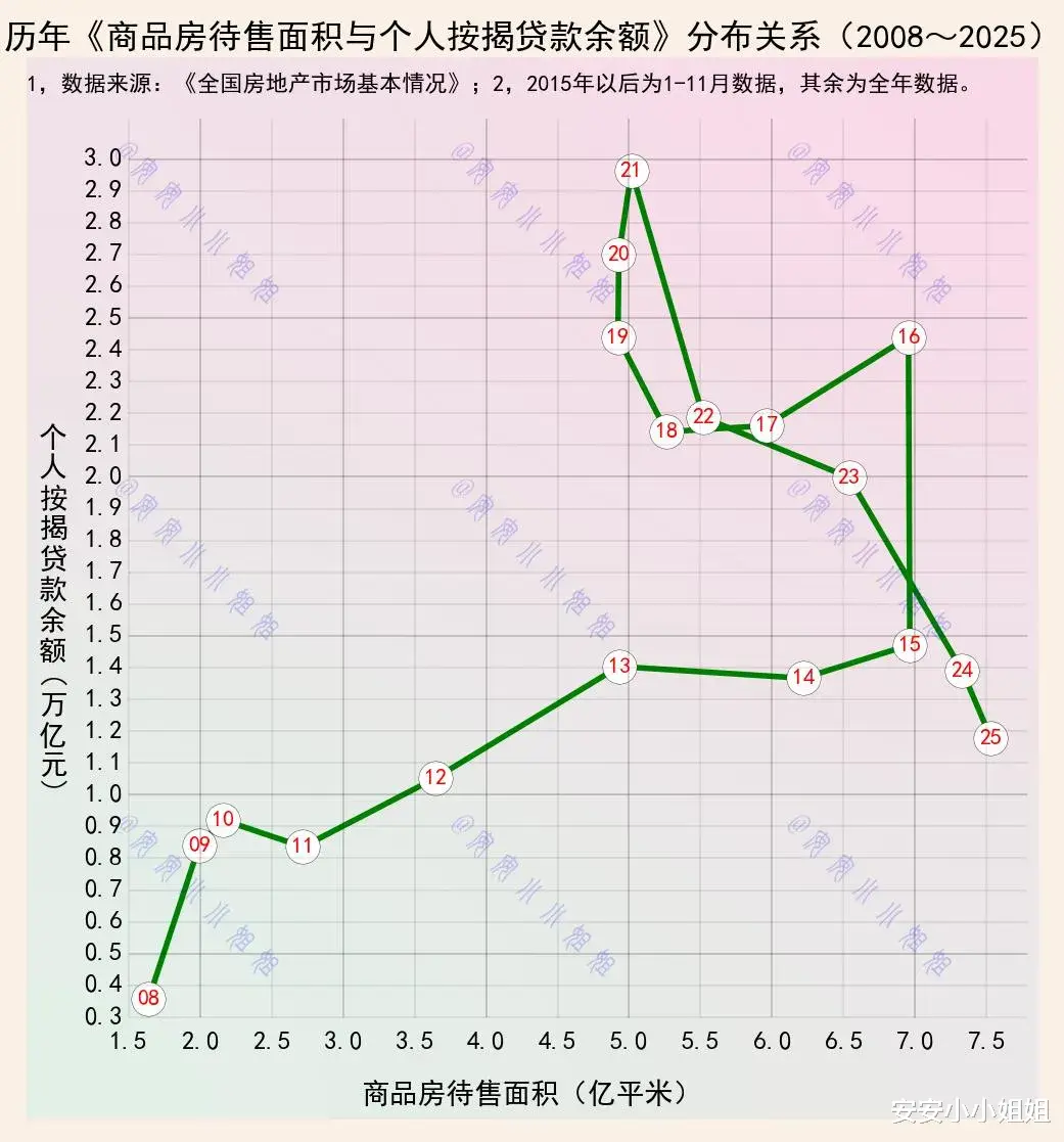 这张2008年至2025年的关系图,清晰地记录了中国房地产市场在十几年间走过的独特轨迹,揭示了库存与信贷这两个关键变量之间复杂而深刻的互动。