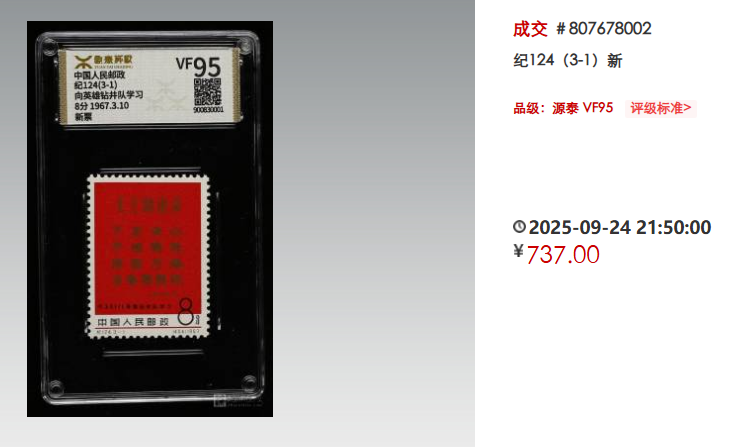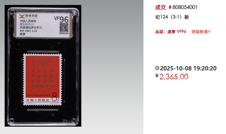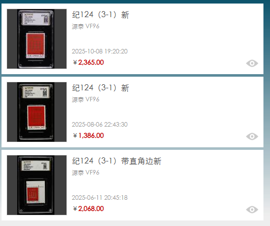 只能一方面感叹下国庆期间可能市场较好,有一部分热钱涌入,另一方面我也事后去看了下,首先纪124(3-1)本是筋票,其价格就会比其他高一些。然后该评级票并没有那么多流入市场,而其中96分更是少之又少,赵涌上总共只有三条成交记录,对比同品相来说比两个月前都贵了1K,如果每个人都是和我一个心态,或者就是少这一张的评级票,那这个拍品肯定会被大家追高。玩盒子票,分高还真是硬道理啊,所以有的玩家专用裸票去博个评级高分也是可以理解的。