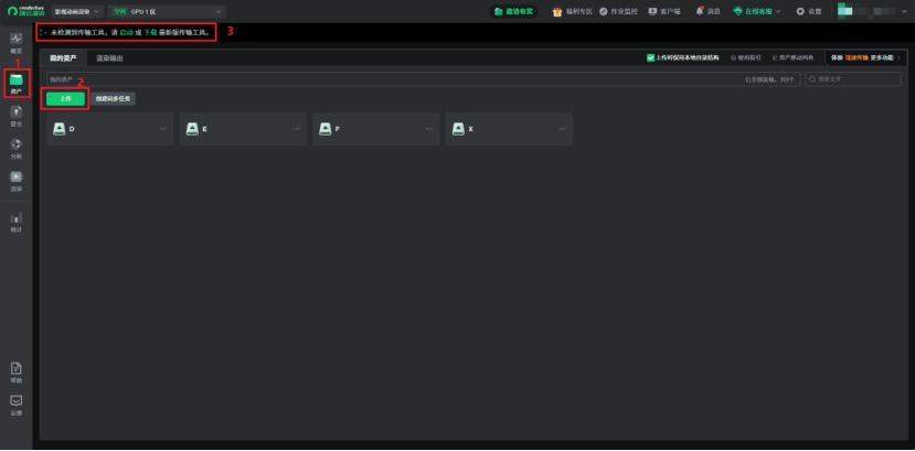 步骤一:上传资产登录渲染网页端,进入资产界面。下载并安装传输工具,安装完成后,单击启动传输工具;