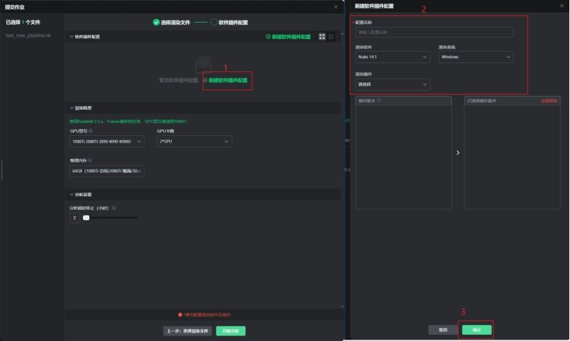 2、进行软件插件配置,在配置框中,逐步设置配置名称、渲染操作系统、软件和插件。如果没有找到所需的插件信息,可以反馈给客服进行添加。设置完成后,点击【确定】;