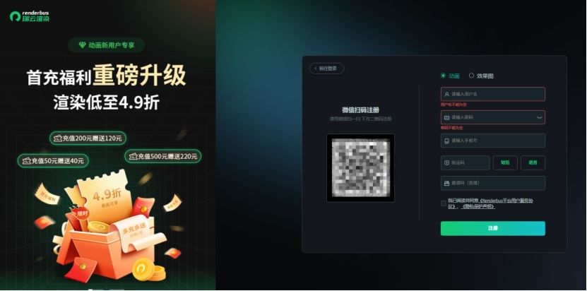 访问【renderbus瑞云渲染网站】注册账号,如是渲染动画则注册动画账号即可。