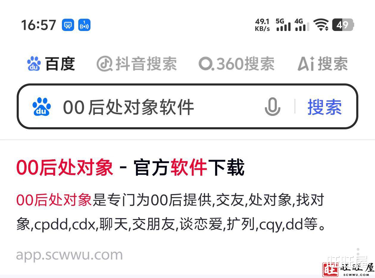 第二步:打开浏览器或者手机自带浏览器,我们在地址栏上直接输入00后处对象软件官方下载,然后点击搜索,我们可以看到搜索结果,如果搜不到的话,可以选择通过应用宝,360手机助手,豌豆荚,百度手机助手,输入00后处对象,进行搜索。