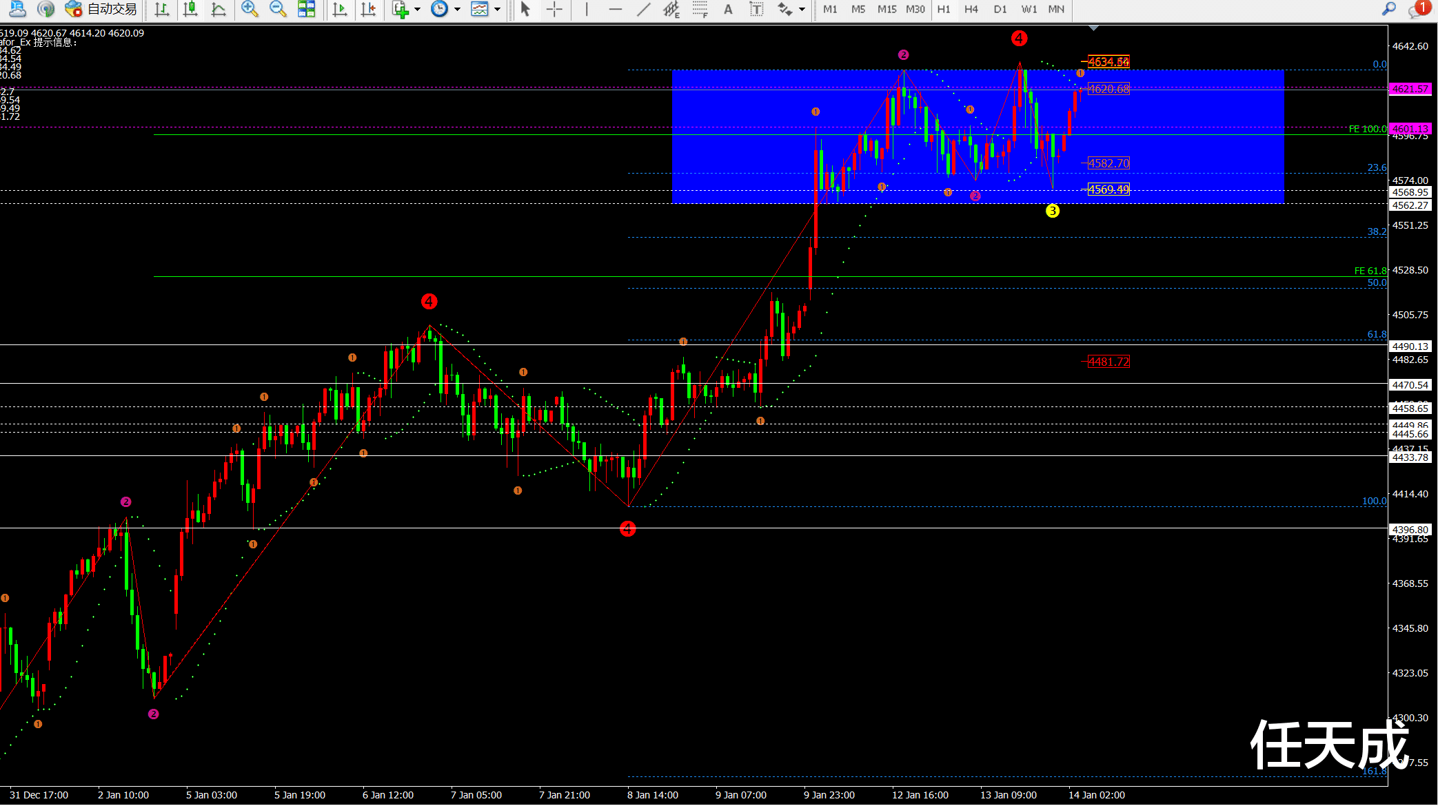 所以日内目前只能在4630-33附近去空一次,剩下的去4650-4680附近去尝试空;多单就只能在4597-4600附近参与。