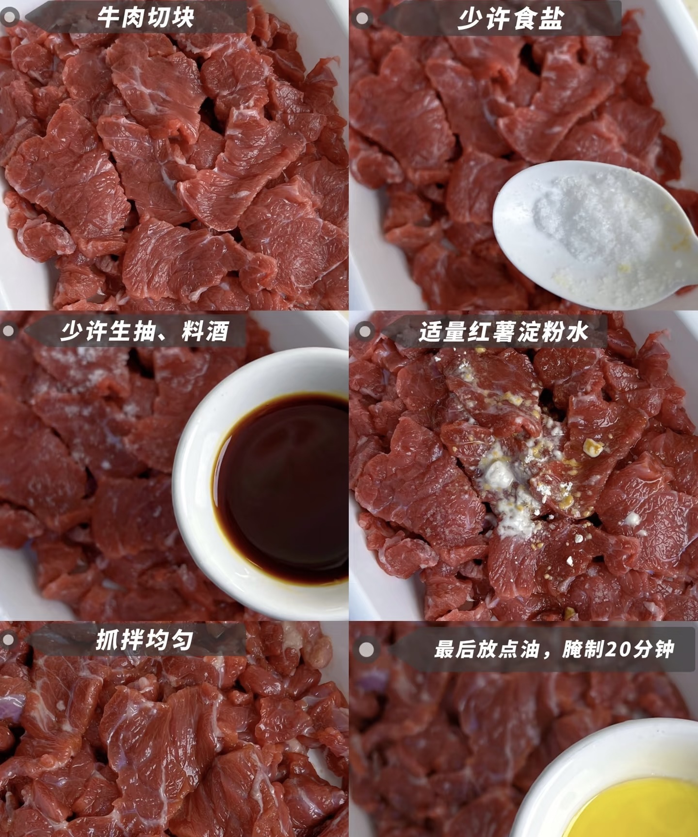 接下来,我们开始处理食材。将牛肉切成薄片,放入少许盐、生抽、料酒和红薯淀粉水,用手抓拌均匀。这样可以让牛肉更加入味,并且红薯淀粉水可以使牛肉更加嫩滑。接着,再加入少许油,锁住牛肉的水分,腌制 20 分钟。在腌制牛肉的过程中,我们可以把其他食材处理好。将洋葱切成丝,青红辣椒切成小段,蒜头切末,干辣椒剪成段。酸菜洗净后,切成小块备用。