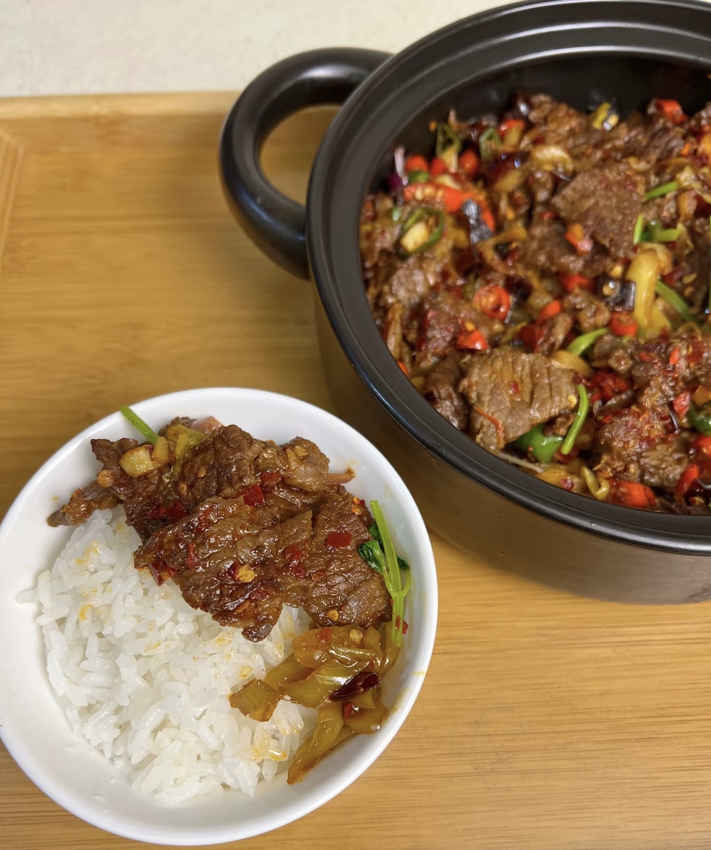 最后,我们来处理砂锅。在砂锅内放入洋葱丝,加入一点点油和椒盐粉。用小火加热,让洋葱散发出香味。当洋葱变软后,放入前面炒好的牛肉,焗个 30 秒。这样可以让牛肉更加入味,同时也可以保持菜肴的温度。最后,再撒上一些辣椒面,增加菜肴的辣味和色泽。