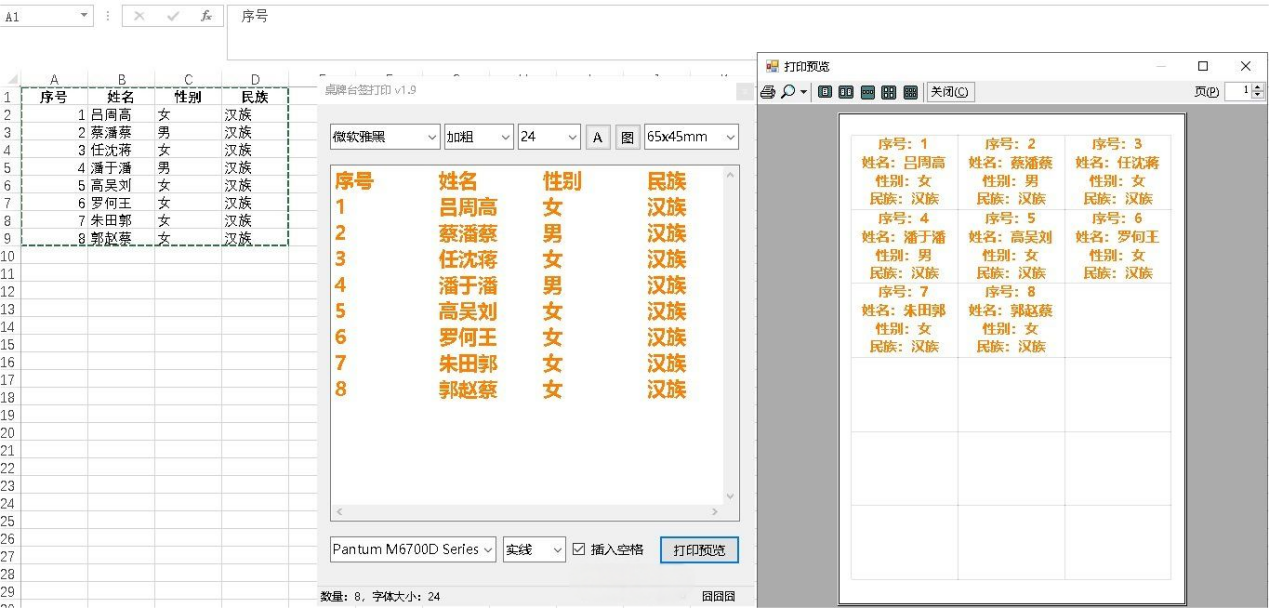 简介:桌牌、台签、席卡、座位牌、批量快速双面打印程序, 支持自定义字体,颜色,规格尺寸,加载背景图片 使用:1、台签规格尺寸,可自定义;(*)号表示镜像模式(x)号表示标签模式(-L)结尾表示横向 2、台签内容,一行一个;插入(Tab)制表符号分行打印,可接受拖入TXT文件、Excel文件、背景图片文件 3、按F7高级设置,F8打印预览 1、高级设置(F7),抬头落款内容可手动录入或选择列