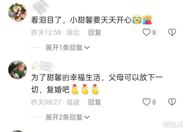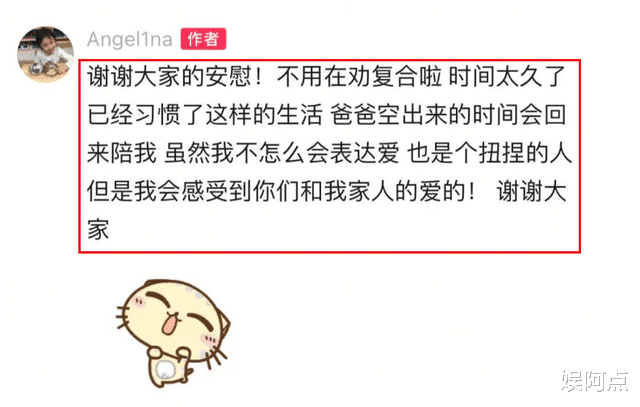不过,12岁的甜馨十分懂事,也很有礼貌。看到评论区里那么多的叔叔阿姨安慰自己,甜馨随即发文表示了感谢,并表示不用再劝复合啦!时间太久了,已经习惯了这样的生活。