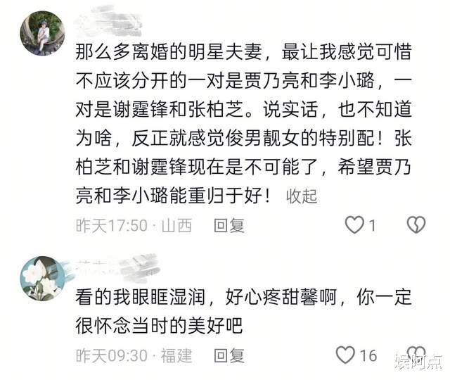 其中一位网友这样说道:“那么多离婚的明星夫妻,最让我感觉可惜不应该分开的一对是贾乃亮和李小璐,一对是谢霆锋和张柏芝。说实话,也不知道为啥,反正就感觉俊男靓女的特别配!张柏芝和谢霆锋现在是不可能了,希望贾乃亮和李小璐能重归于好!”