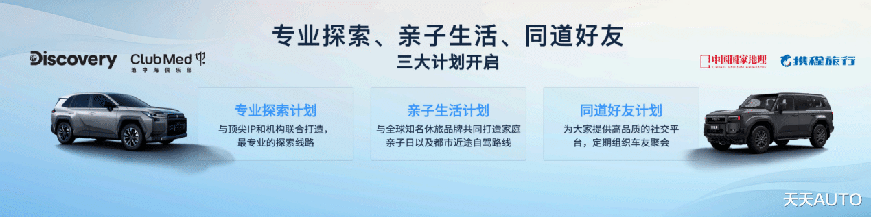 第二,亲子生活计划。一汽丰田将与全球知名休旅品牌共同打造家庭亲子日及都市近途自驾路线。让用户利用周末时光,和孩子一起驾车、徒步、赏景、观星,守护成长,见证幸福。