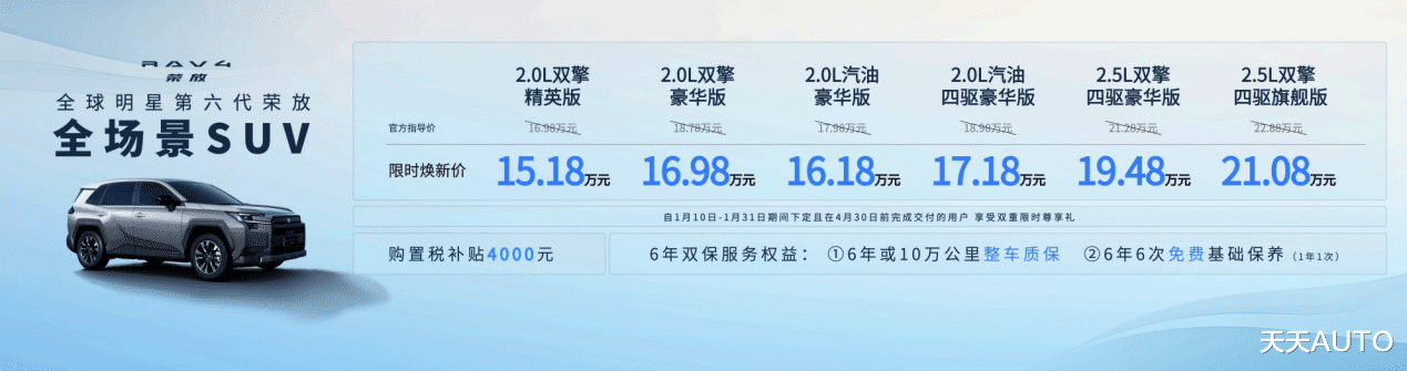 全能担当全新荣放,作为本次交付的主角,其官方价格区间为16.98万元-22.88万元,限时焕新价15.18万元-21.08万元。1月10号-1月31日期间下定且在4月30日前完成交付的用户,即可享受4000 元购置税补贴+ 6年双保服务权益,实惠满满,诚意十足。
